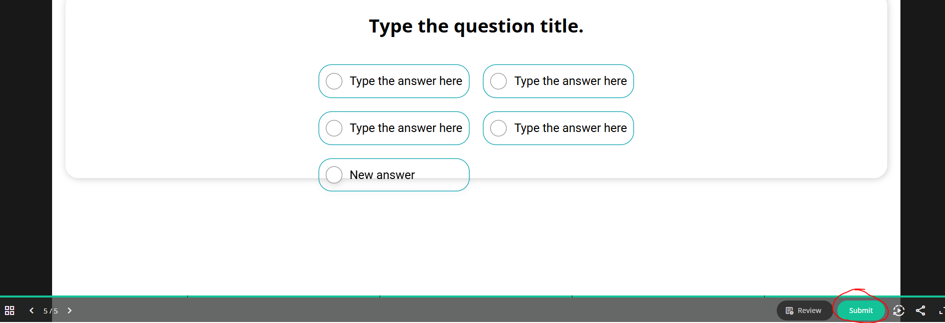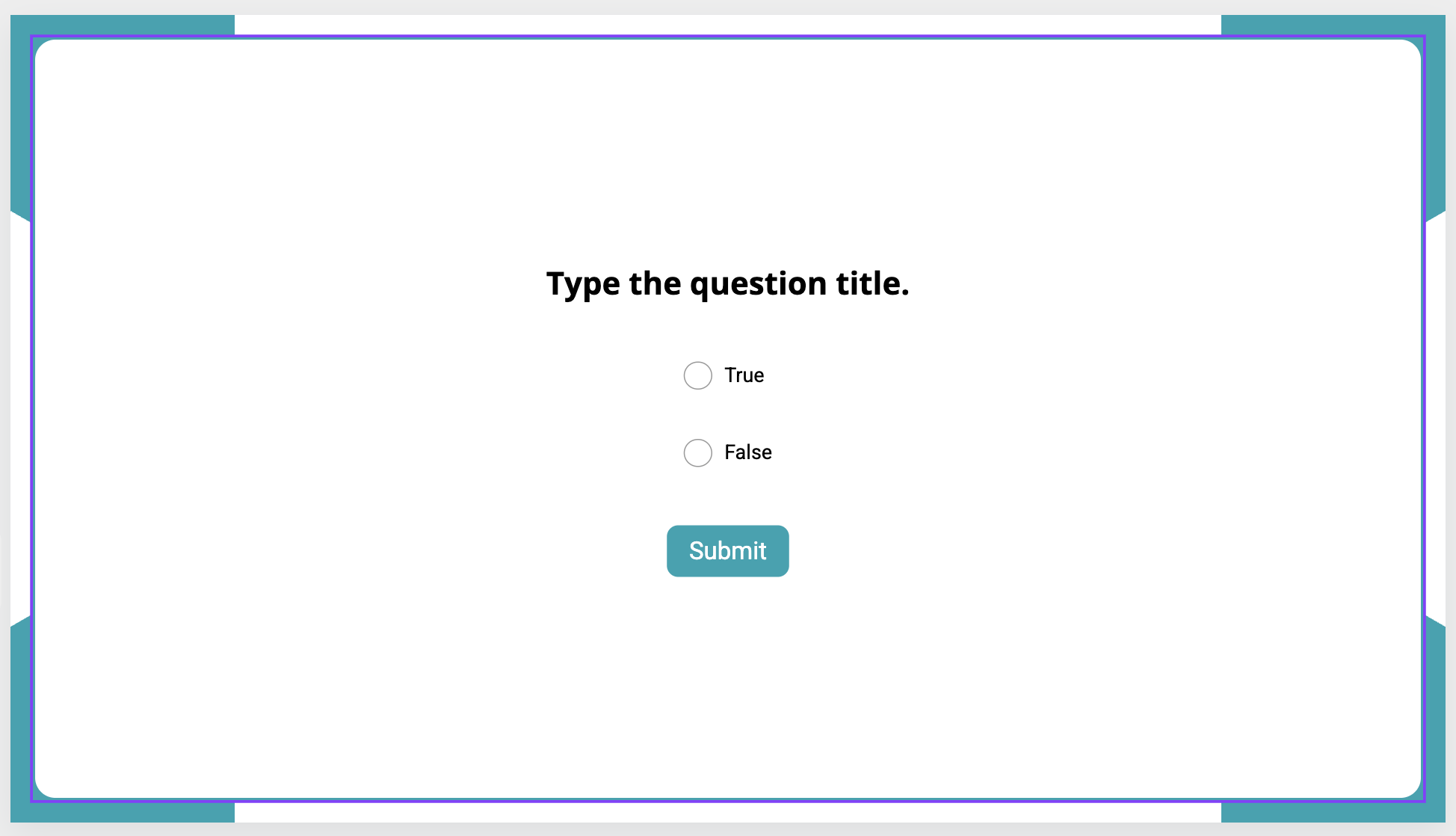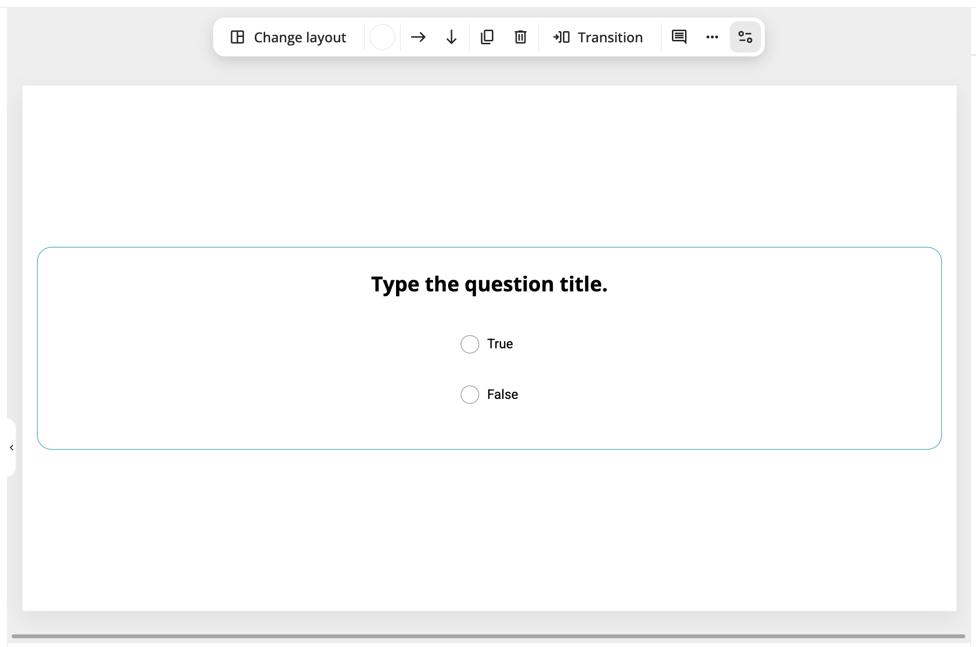 When presentations are made with AI, adding questions creates a slide with everything required for the question, including a configured Submit button; when presentations are made manually and you add a question, there is no button included so it must be added and configured manually. The first image below is a T/F question added in an AI-generated presentation; the second is a T/F question added in a manually-created presentation: