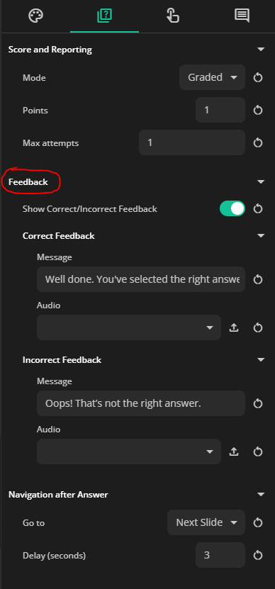 Slides Advancing on Questions: I’m a bit confused on how the slide advance works with questions. I see in the preview from the uPresenter interface in the browser that if the answer is correct, the slide advances. But if it’s incorrect, even if there’s only one attempt set, it doesn’t advance. The learner needs to press submit again and get a note that they’ve used all chances or use the arrows in the bottom left corner. In the question properties, I see an option for Navigate After Answer and Delay; is this related to those? It doesn’t seem to be related to correct or incorrect.