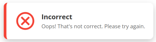 Right now, you’ll see the “Incorrect” feedback message, and you can edit the text inside it, for example: